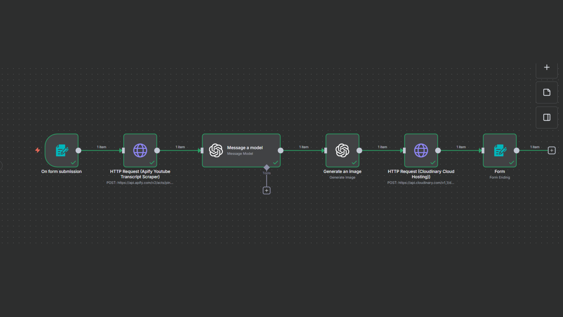 Content creators spend hours turning long YouTube videos into summaries, slides, and visuals. This workflow solves that problem end to end. With a single video link, it automatically extracts the transcript, summarizes the content, generates a high quality sketchnote style infographic, hosts the image, and returns a shareable link to the user.