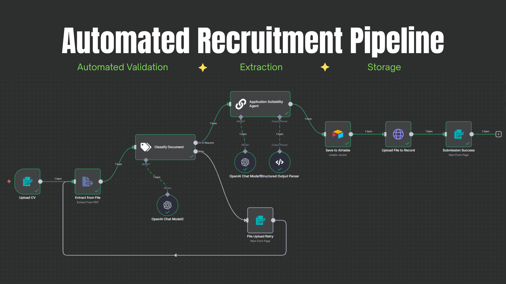 The n8n workflow presented here eliminates these inefficiencies by automating the complete CV intake and processing pipeline. Using intelligent forms, AI-powered validation and seamless backend integrations, it transforms hiring from a manual operation into a streamlined, self-executing system that requires zero human intervention.